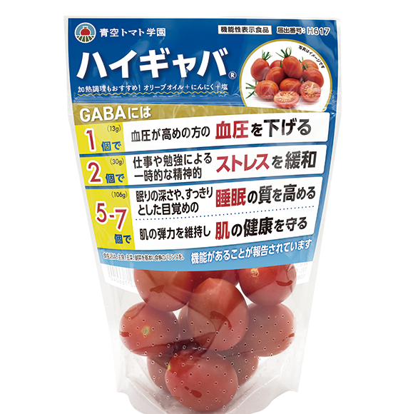 ハイギャバトマトは、ゲノム編集技術で通常の約12倍のGABAを含有する高機能性トマトです。遺伝子組換えとは異なり、自然界の突然変異と同じ仕組みのため安全性が確認されており、高めの血圧低下、ストレス緩和、睡眠の質向上・肌の健康維持が期待される機能性表示食品です。